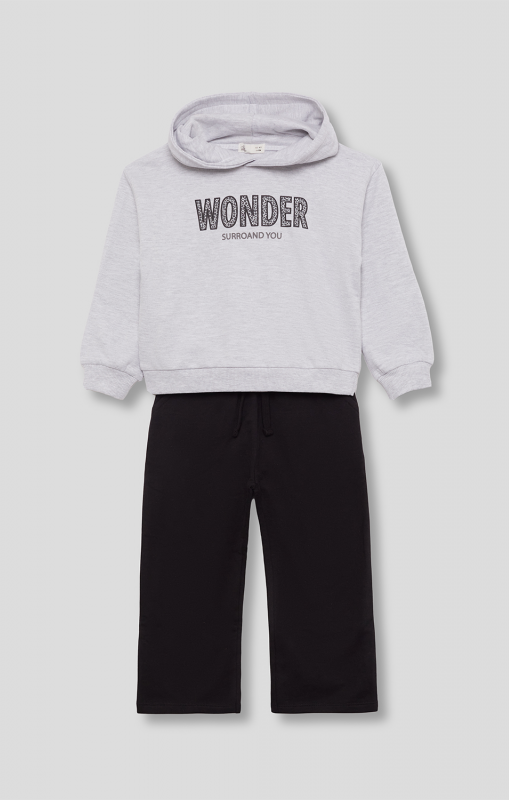 Conjunto de 2 piezas sport chica compuesto Sudadera de felpa perchada color gris vigoré con capucha, puños y bajo en canalé. Incorpora diseño frontal con el texto “WONDER SURROUND YOU”.