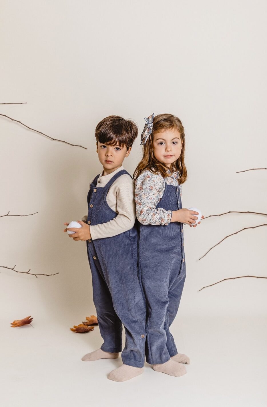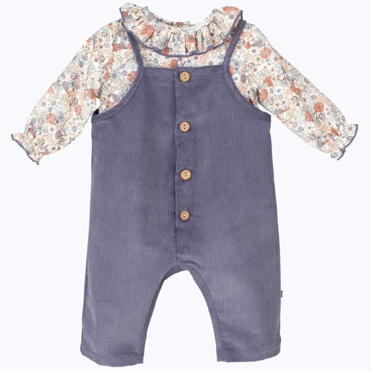 Conjunto clusa y peto en tonos azules.