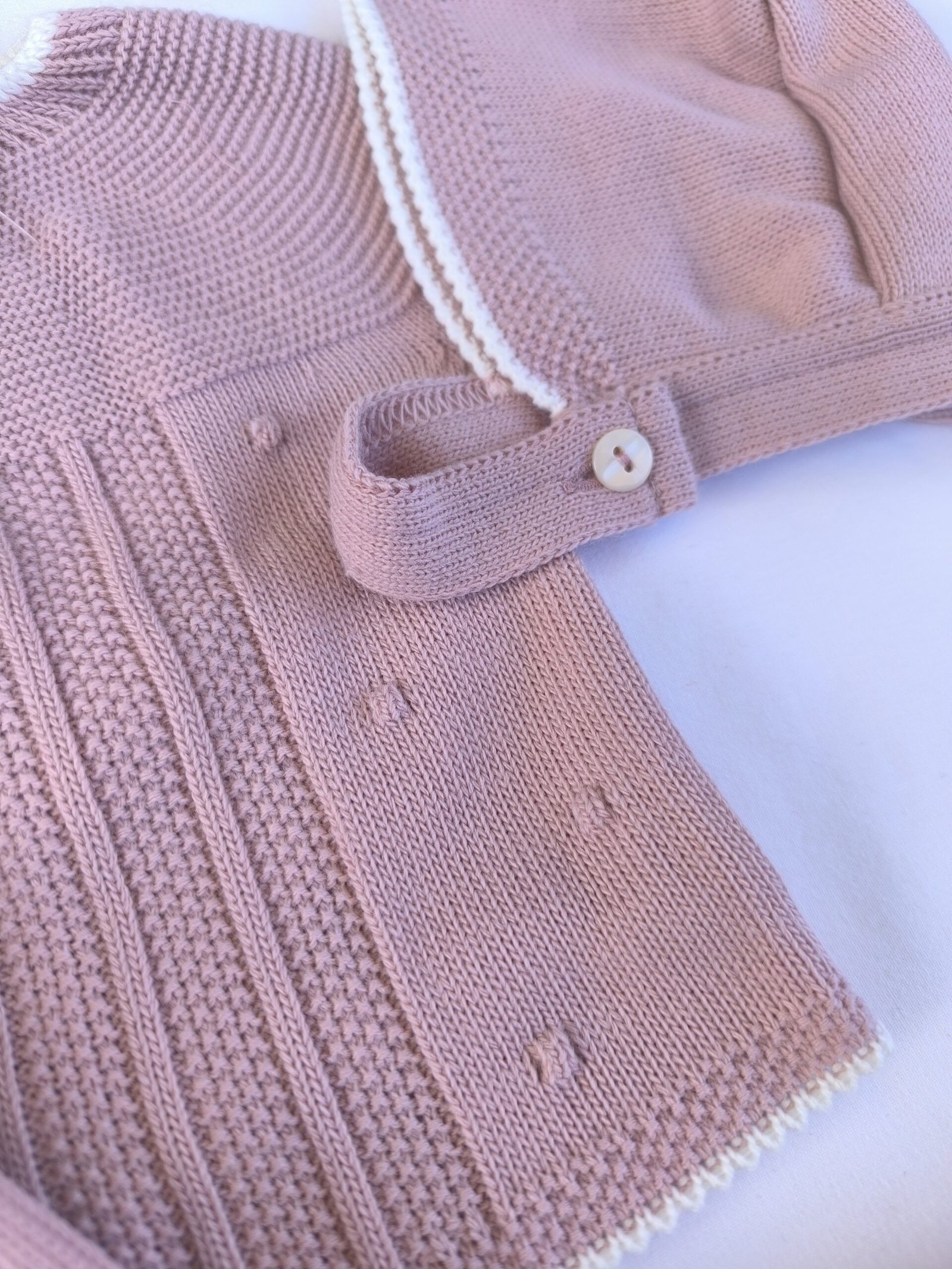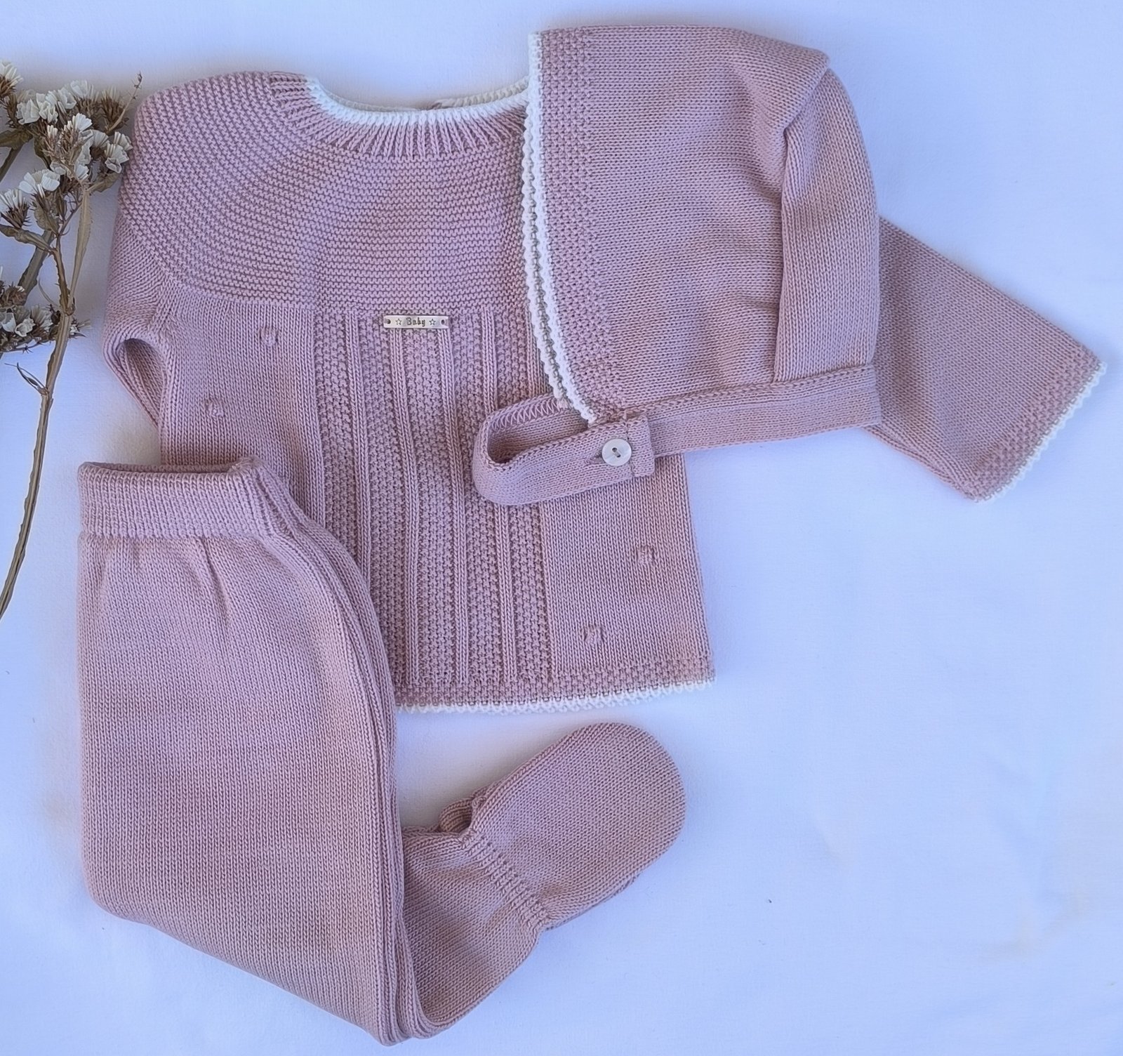 Conjunto 3 piezas de jersey, polaina y capota en color rosa empolvado.