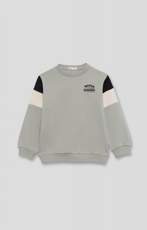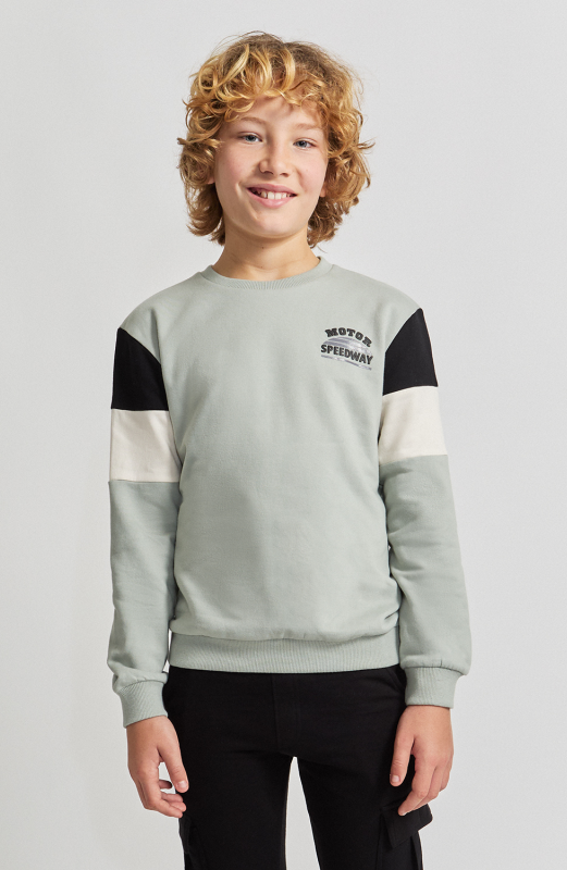 Sudadera de manga larga en tejido de punto suave, presenta cuello redondo, puños y bajo elásticos en canalé. Incorpora detalle frontal con texto “MOTOR SPEEDWAY” y diseño de bloques de color en crudo y negro en la parte superior de las mangas.