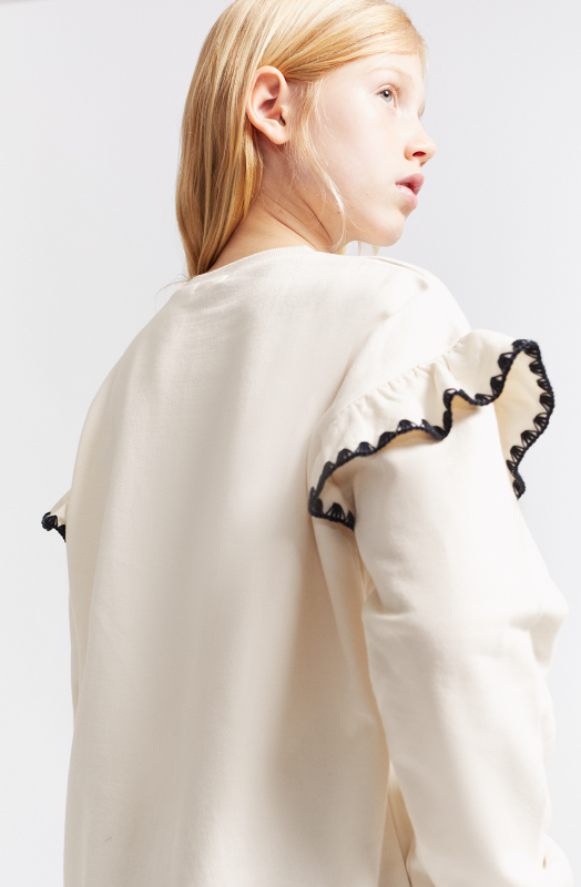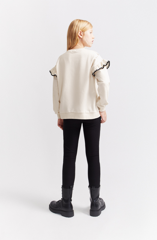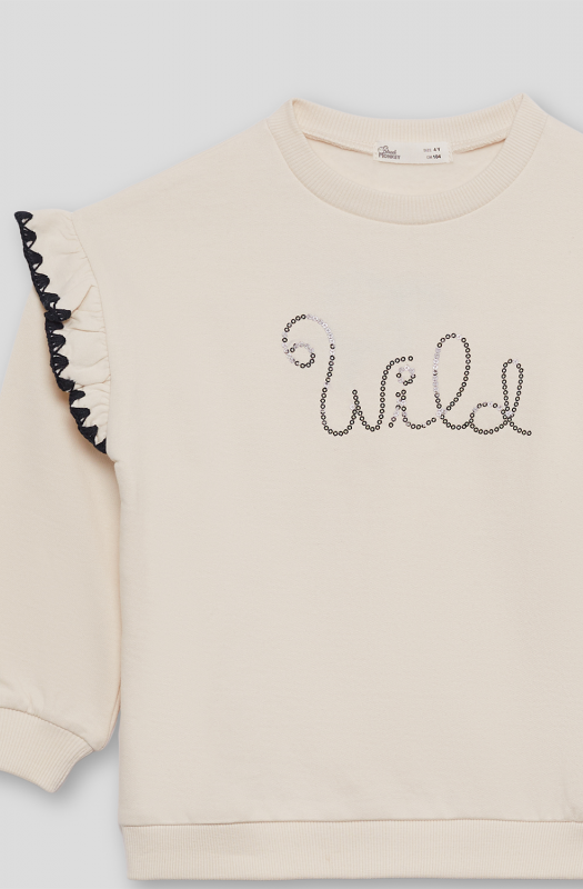 Sudadera de niña en color blanco roto. Sudadera de manga larga en tejido de felpa suave con cuello redondo y puños de canalé. Presenta volantes en los hombros decorados con cinta de encaje negra y detalle frontal con la palabra «Wild» bordada con pequeñas lentejuelas negras.